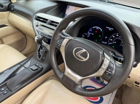 LEXUS AND ONE OWNER FROM NEW / SERVICE HISTORY / RECENT SERVICE / MOT DECEMBER 2026 - AUTO - HYBRID - ELEC SUNROOF, REVERSE CAMERA, NAVIGATION, HEATED CREAM LEATHER, ELEC SEATS WITH MEMORY, CRUISE CONTROL, FRONT AND REAR PARKING SENSORS, BLUETOOTH, DAB RADIO, DVD PLAYER, USB PORT, AIR CON, AUTO LIGHTS/WIPERS, POWER FOLD MIRRORS, ALLOYS AND MUCH MORE! - LEXUS AND ONE OWNER FROM NEW - SERVICE HISTORY - RECENT SERVICE AT 106K MILES - MOT DECEMBER 2026 WITH NO ADVISORIES - FREE 3 MONTHS NATIONWIDE PREMIUM WARRANTY COVER INCLUDED (Extended Warranty Available) - BOOK PACK/OWNERS MANUALS INCLUDED - HPI CHECKED AND CLEAR - This Lexus RX 450h Advance from 2014 boasts an impressive MOT valid until December 2026, offering you peace of mind for the road ahead. This Four Wheel Drive model features a 3.5L Petrol Hybrid engine, combining efficiency with performance. With a clear vehicle history check and a recent service at 106,000 miles, this car comes with a 3 month warranty for added reassurance. Inside, you'll find comfortable front heated seats, a dual zone climate control system with a pollen filter, and a smooth electric sunroof. The Advance trim also includes a smart entry and start system for effortless access and a Bluetooth connectivity feature for your convenience. Experience the responsive acceleration of this Lexus RX, reaching 0-62mph in just 7.8 seconds, a testament to its powerful yet efficient hybrid technology. This vehicle also sits in a low insurance group, which can help to reduce your running costs compared to similar cars. The combination of its advanced features, robust provenance, and dynamic performance makes this Lexus RX 450h Advance a compelling choice for those seeking a premium and practical SUV.- Dimensions